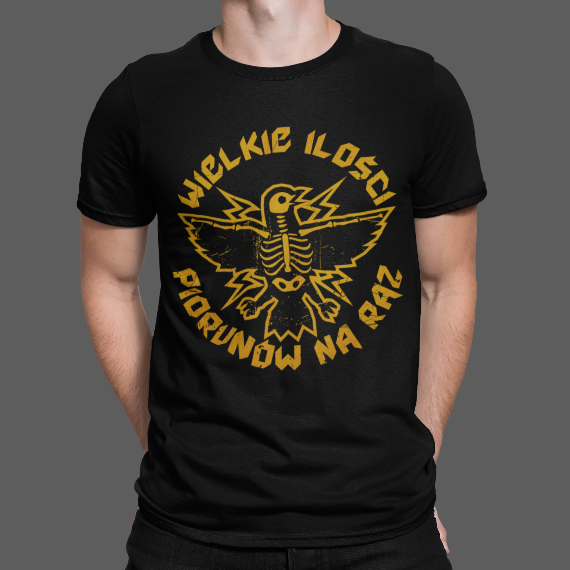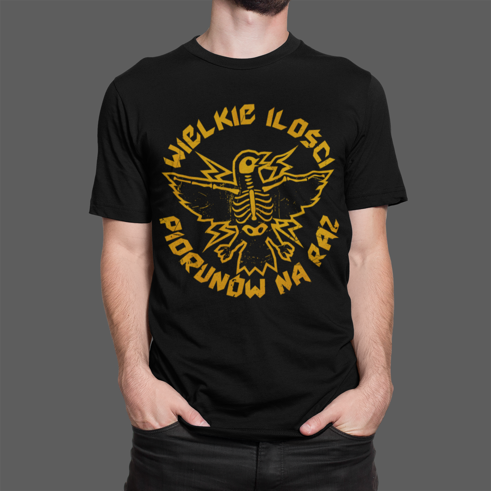Koszulka z żółtym ptakiem (papieska). Czyli taka sama jak z białym, ale z żółtym. Ma fajnego żółtego ptaka i jest też super wygodna. Z przodu herb z tyłu napis (żółty), także wszyscy wiedzą że masz dobry gust muzyczny. 100% bawełna i 100% zajebistości.